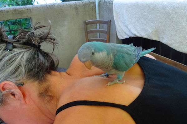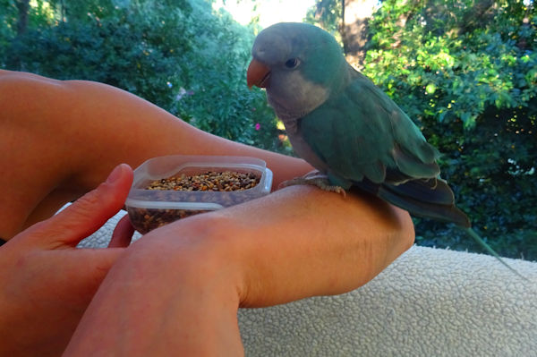 Le temps que j’aille chercher mon appareil photo après avoir prévenu Anti et je l’ai retrouvée avec l’oiseau sur son poignet. Elle m’a dit qu’il lui avait juste suffi de le tendre pour que l’oiseau vienne s’y poser. Elle a appelé des amis qui s’y connaissent et qui lui ont dit qu’il s’agit peut-être d’un inséparable. Sur internet, il ressemble exactement au quaker bleu, aussi nommé perruche moine. On l’a mis dans une cage pour qu’il soit protégé des chats et il se trouve qu’on a aussi des graines pour les oiseaux qui passent dehors, cela lui a permis de manger avec appétit.