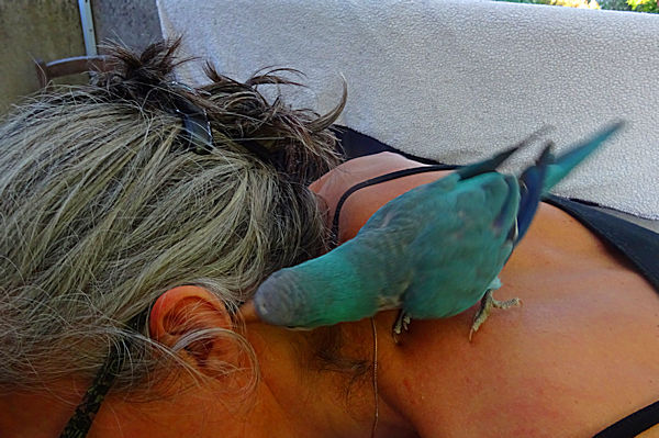 Quel bel oiseau , il a du sentir que c’était la maison du bonheur , en plus il est très familier puisqu’i vient se poser sur l’épaule d’Anti , j’espère qu’il va retrouver son proprietaire lol il est actuellement entre de bonnes mains !