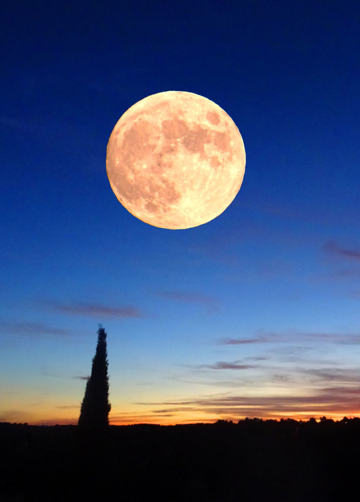 La photo de la pleine Lune et celle de l’horizon au coucher de soleil qui composent le montage utilisé ci-dessus datent d’il y a quelques semaines et ont été prises depuis le bois des Espeisses.