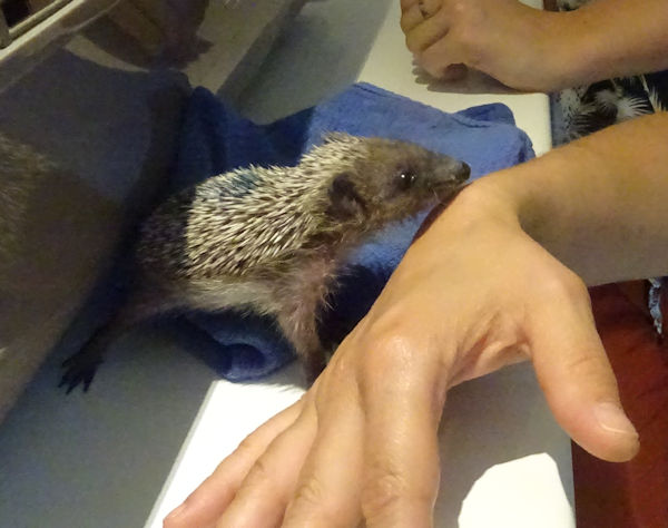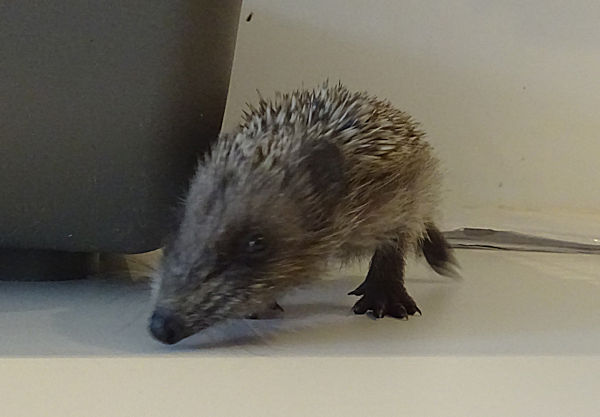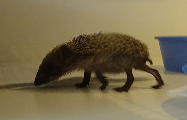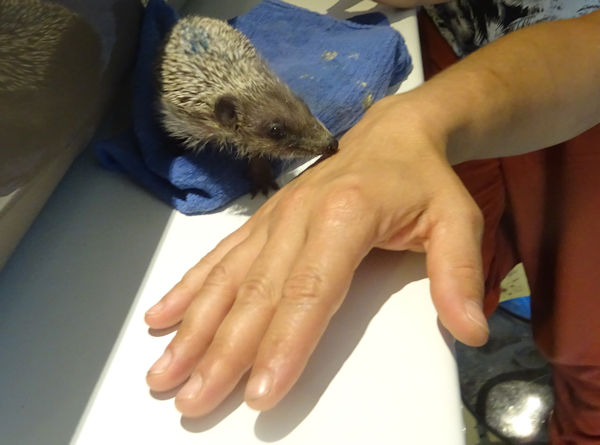 Lors de notre passage à l’Hôpital de la faune sauvage, nous avons fait la connaissance d’un tout petit bébé hérisson, tellement petit qu’il avait l’air d’avoir des pattes hyper longues sous son tout petit corps mince, pas du tout arrondi comme celui des grands hérissons. Voyez plutôt :