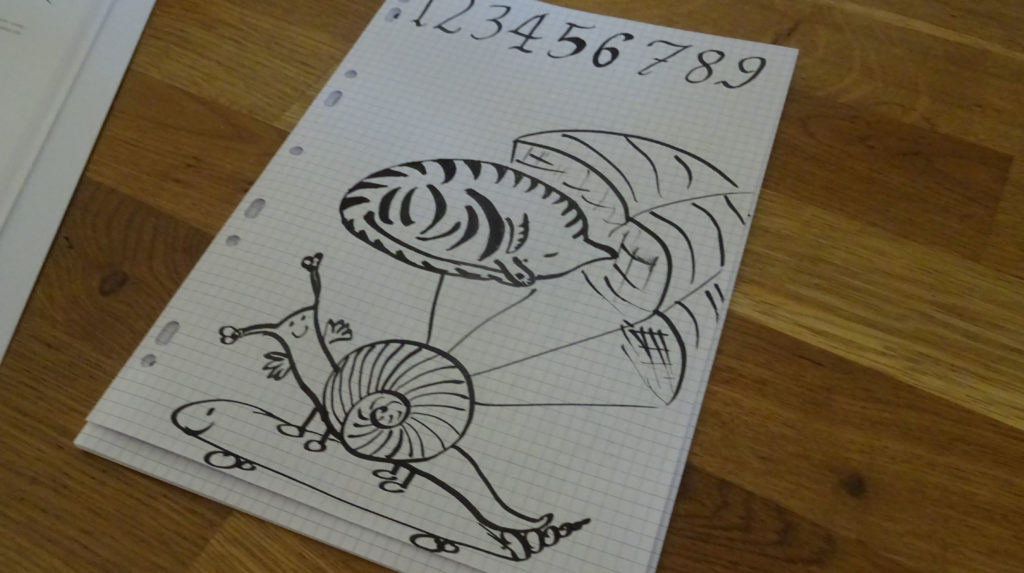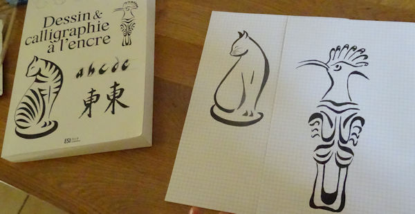 Il y a quelques jours, nous sommes passés à Cultura pour acheter les fournitures scolaires d’Enzo, qui va intégrer une première spécialisée en art appliqué. Anti n’a pas laissé passer l’occasion, elle qui adore calligraphier. Elle a presque acheté plus de choses pour elle que pour Enzo, c’est dire. Et hier, elle s’y est mis. Elle a commencé par un dessin de chat :