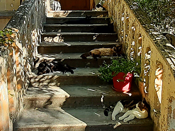 En rentrant de petites courses d’appoint hier en fin d’après-midi, j’ai vu six de nos chats qui attendaient patiemment que le restau, euh, la maison ouvre sa grande porte. Très soucieux des précautions à prendre en ces temps troublés, ils respectaient parfaitement (par rapport à leur taille) une distanciation sociale stricte. Admirable sens civique que voilà. Bravo !