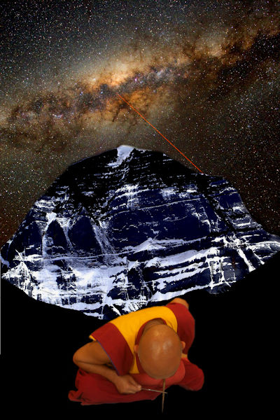 Le visuel qui illustre cette composition a été assemblé à partir d’une photo du mont Kailash, d’une vue de la Voie lactée et d’une photo que j’ai prise d’un moine du Ladakh venu en France en 2012, en train de commencer un mandala.