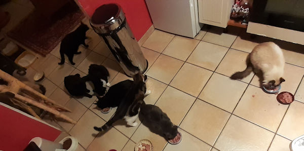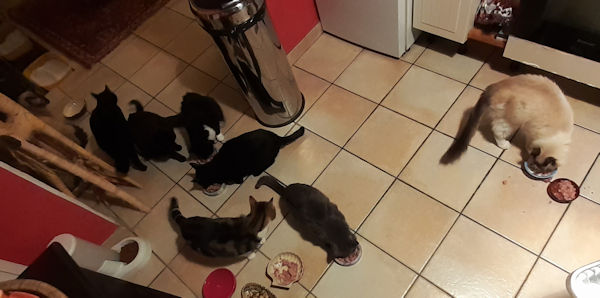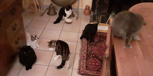 Bon d’accord, ces vacances ne seront pas comme les autres puisqu’elles commencent par l’instauration d’un couvre-feu pour cause de pandémie. C’est vrai que ce n’est pas tous les jours. Mais bon, même si cela nous désole profondément pour les professions que cela impacte directement (spectacles, restaurants, bars…), nous, ça ne nous touche pas plus que ça. Avec le virus, on n’a pas trop tendance à sortir le soir de toutes façons, et ça ne change rien pour faire les courses. Et puis, à l’intérieur de notre maison, pas de couvre-feu, pas de distanciation sociale, pas de masque, surtout pour nos chats. Regardez comme ils sont à l’approche de l’un des repas du soir, devant la cuisine :