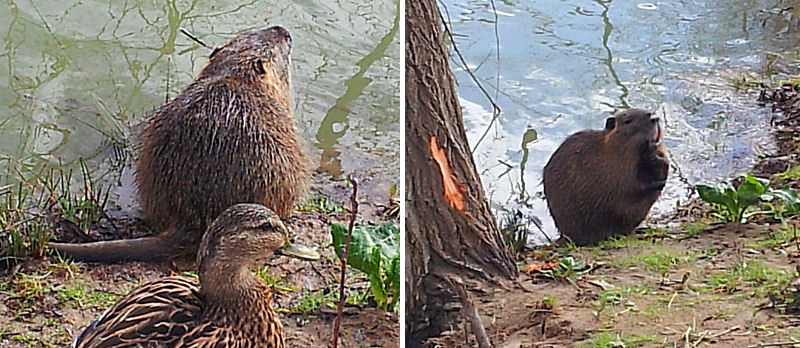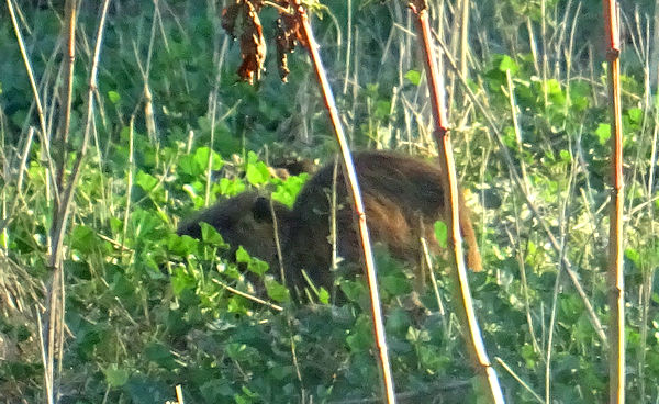 Nous avons regardé ce qu’on trouvait comme images sur Google. Sûrement pas un castor (la queue ne colle pas), ni un vison (il était bien plus grand). Finalement, nous pensons qu’il doit d’agir d’un ragondin. Nous avons déjà eu le bonheur de croiser ces sympathiques grands rongeurs au bord de la Vidourle à Sommières il y a quelques années (en novembre 2013). Voici deux photos prises à cette occasion, sans difficulté cette fois puisqu’on pouvait mieux l’approcher :