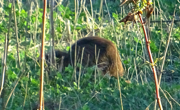 Vers la fin de notre promenade à l’étang de Méjean, nous avons vu, dans un petit près non accessible aux visiteurs, un animal aux longs poils fauve, difficile à reconnaître puisqu’il gardait quasiment tout le temps sa tête enfouie dans les herbes, probablement en train de manger quelque chose. Voici ce que j’ai eu de mieux comme photos, très agrandies :