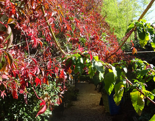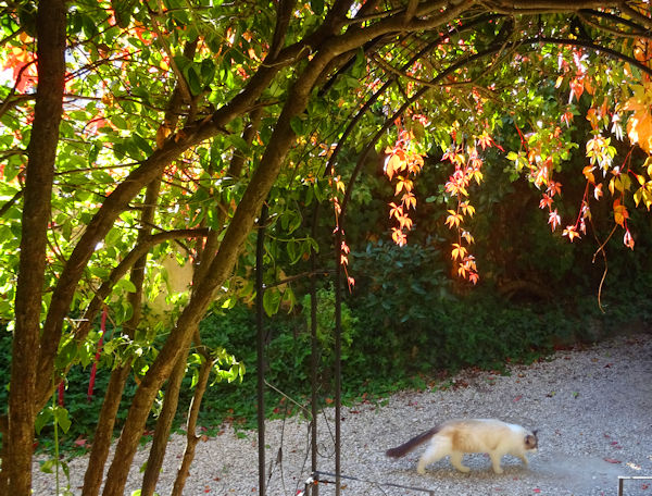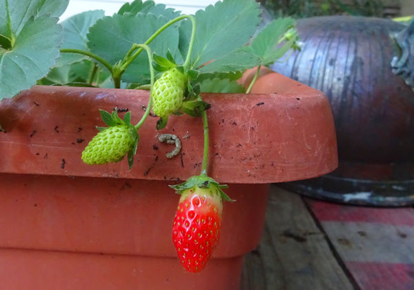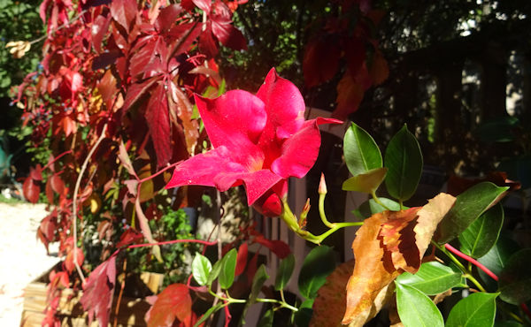 Alors que, depuis hier, le ciel s’est fait nuageux et même humide, la semaine dernière, nous avons eu quelques jours qui sentaient carrément le printemps : température douce, soleil radieux, végétation en pleine forme. Seules les feuilles rouge vif de la vigne vierge rappelaient qu’on était en octobre. En revanche, on a même eu des fraises qui sont sorties, alors qu’elles poussent sans aucune protection particulière. Plaisir des yeux…