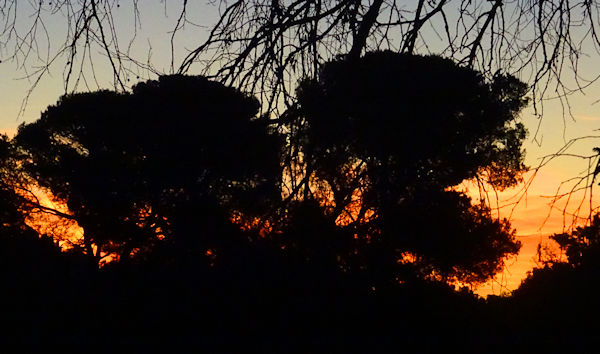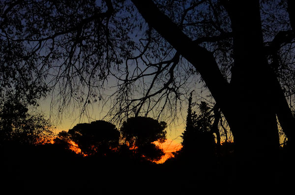 Ces levers de soleil à l’arrière de notre jardin sont incroyablement beaux et c’est vrai qu’à partir du milieu de l’automne, du fait de l’inclinaison de l’axe de la Terre, ils se décalent de plus en plus vers le quadrant sud-est et se rapprochent du micocoulier ce qui donne ces effets féériques dans les branchages (le soleil se lève dans le quadrant nord-est entre l’équinoxe de mars et celui de septembre, du coup, plus derrière le garage des voisins).