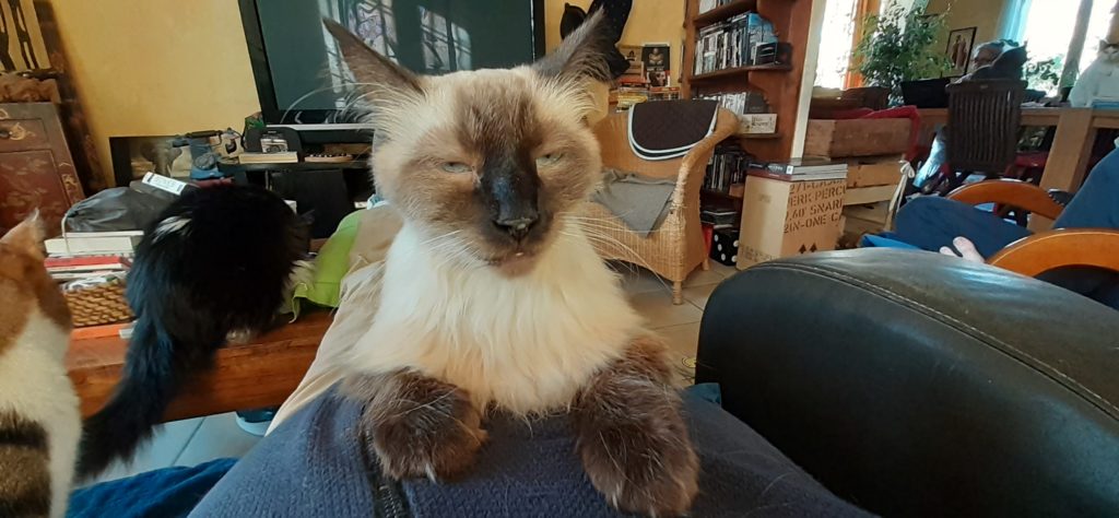 Une photo de notre cher Totoro venu faire une pause sur ma cage thoracique, comme il le fait très souvent. Quand je l’ai vu comme ça, j’ai tout de suite vu le Sphynx, pas en pierres mais en vrai, dans toute sa gloire et sa majesté. Vous ne trouvez pas ?