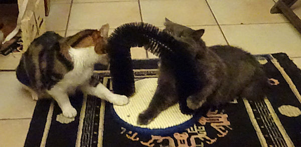 Bande de junkies !!! Mais force est de reconnaître que c’est très impressionnant. Après avoir imbibé le jouet, j’ai planqué la bouteille au milieu d’une étagère. Quelques minutes plus tard, notre Lulu était en train de l’escalader pour aller directement à la source en miaulant : J’vous jure ! Y’en a !!! J’le sens ! J’en veux !!! ». J’ai mis qqs gouttes sur le sol, et hop ! il s’est roulé dedans avec une délectation bien visible. D’ailleurs, je les comprends, moi-même, j’aime beaucoup la valériane qui est un excellent décontractant musculaire.