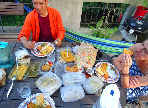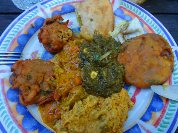 Nous avons pris du dal de lentilles, du palak paneer, une spécialité du chef à base de légumes variés, du riz biryani, des samossas, des beignets d’aubergine, des beignets d’oignons et quelques pains naan.