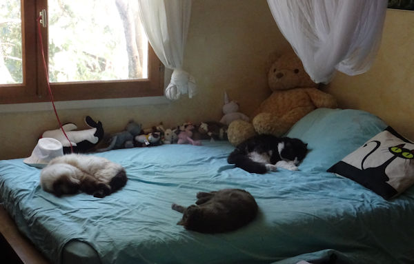 Il arrive que certains de nos chats se chicanent. Rien de grave, mais si, parfois, les poils volent. Et, parmi ceux-là, il y a Totoro, Will et Paco – pas les trois ensemble, mais deux à deux, sans qu’on sache trop pourquoi. Sauf en une circonstance bien précise : la sieste. Et là, les trois peuvent très bien dormir paisiblement sur le même lit pendant tout l’après-midi, dans la plus parfaite quiétude.
