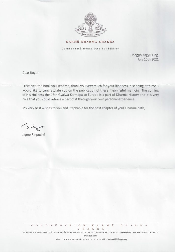 J’ai reçu le livre que tu m’as envoyé, merci beaucoup pour ta gentillesse de l’avoir fait. Je voudrais te féliciter pour la publication de ces mémoires pleines de sens. La venue de Sa Sainteté le XVIe Gyalwa Karmapa en Europe fait partie de l’histoire du Dharma et c’est vraiment beau que tu aies pu en retracer une partie à travers ta propre expérience.