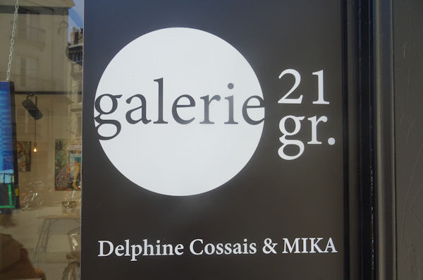 Nous avions déjà croisé la route des tableaux drôles et beaux de Mika en 2010, il exposait alors à Aigues-Mortes et nous étions aussitôt tombés sous le charme. Là, à Nantes, on a assez vite compris grâce à des affiches annonçant une expo que Mika ne devait pas être très loin. Et, de fait, il tient dans le quartier une galerie nommée 21 grammes (en hommage au film du même titre) où il expose en permanence avec sa compagne Delphine Cossais, elle aussi peintre, dans un genre très différent, sophistiqué et doux.