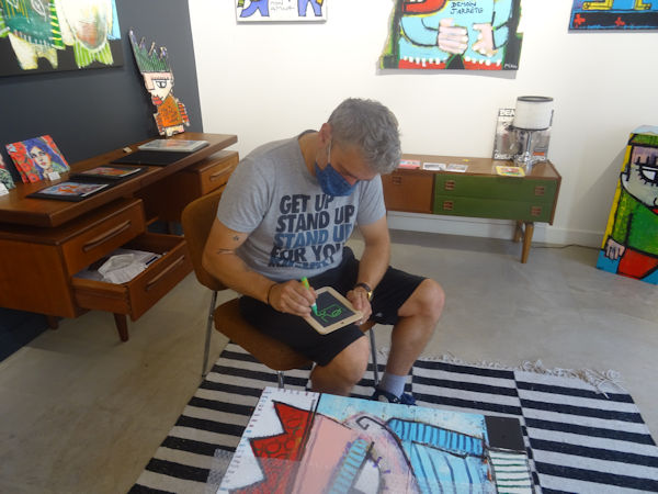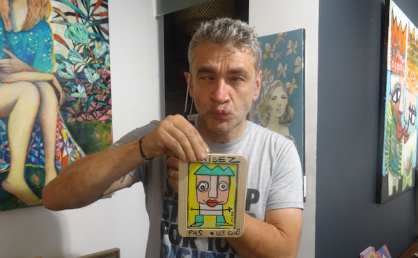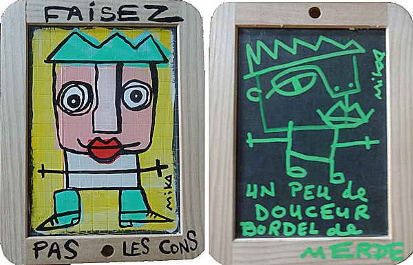 Lors de notre visite à la galerie 21 grammes, nous avons acheté une oeuvre de Mika, peinte au dos d’une petite ardoise, avec la mention « Faisez pas les cons ».