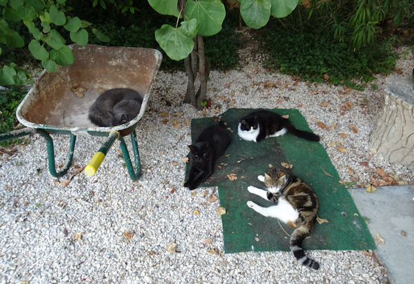Nos chats aiment tellement cette brouette que, lorsque la place est déjà prise, hé ben ils font la queue. Là, voyez-vous, nous avons Tsewa en pole position, papatte en ronds et, sur la moquette, Lulu, Will et Malley qui attendent patiemment leur tour.