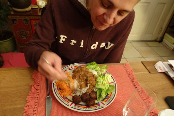 Au menu, riz basmati, curry jaune d’aubergine, petites boulettes vegan, carottes râpées et salade. Un régal ! Elle n’a rien laissé.