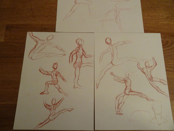 Ne vous laissez pas abuser par le titre de cette note : non, je ne vais pas vous parler d’une courte histoire qui vire au massacre. Un sketch, c’est un croquis et la sanguine est un type de crayon de couleur ocre. Hier, pendant son cours de dessin hebdomadaire, Enzo a exploré quelques croquis de ce genre autour de postures du corps humain, sans utiliser aucun modèle. Le principe est de les dessiner rapidement, sans se préoccuper des petites erreurs. Voyez plutôt :