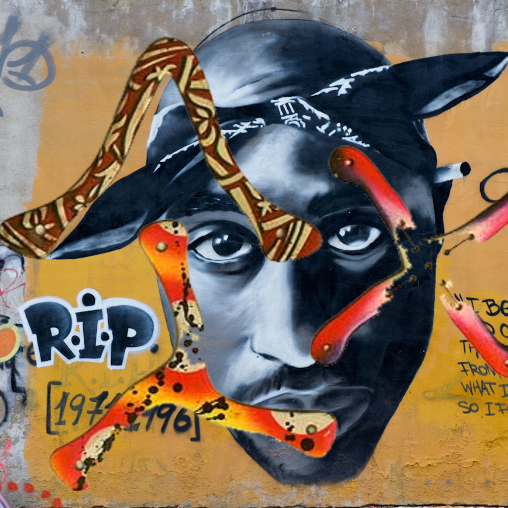 L’illustration est basée sur des boomerangs (titre de ma compo où il est dit que la vie est comme un boomerang) superposés à une oeuvre murale représentant Tupac Shakur, mythique rappeur tué par des petites frappes d’un groupe rival, lors d’une fusillade en 1996 à Vegas.