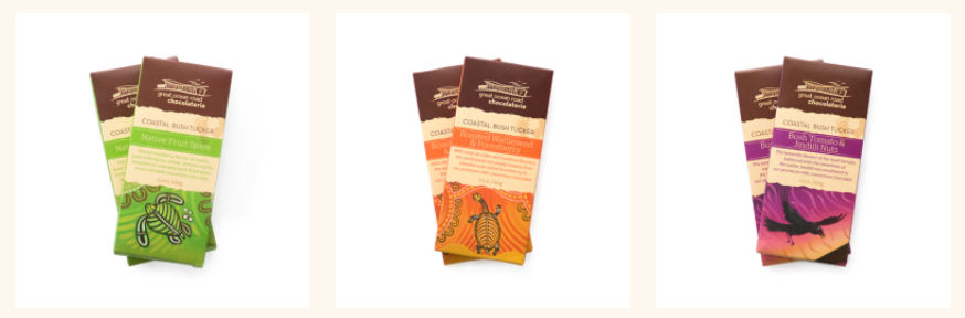 La chocolaterie a également créé une gamme de chocolats Coastal Bush Tucker contenant du bush tucker et des ingrédients australiens indigènes avec un emballage conçu par Nathan Patterson et le produit des ventes va au programme Corroboree Garden.