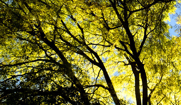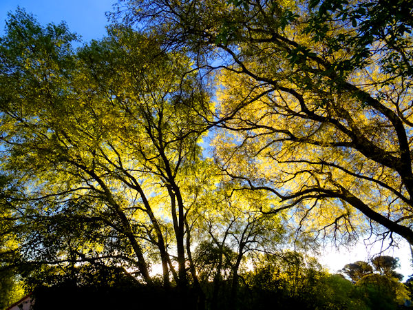 Le moment de grâce n’a duré que quelques minutes. Il était huit heures du matin, je préparais le premier café d’Anti. J’ai vu le ciel recouvert de nuages épais à l’est, sauf une bande dégagée à partir de l’horizon. Le soleil a éclairci les nuages par en-dessous et surtout illuminé les branches des micocouliers chargées de jeunes feuilles. La lumière était magnifique. J’ai pris deux photos. Peu après, le soleil est monté au niveau de la barrière de nuages et tout est devenu gris.