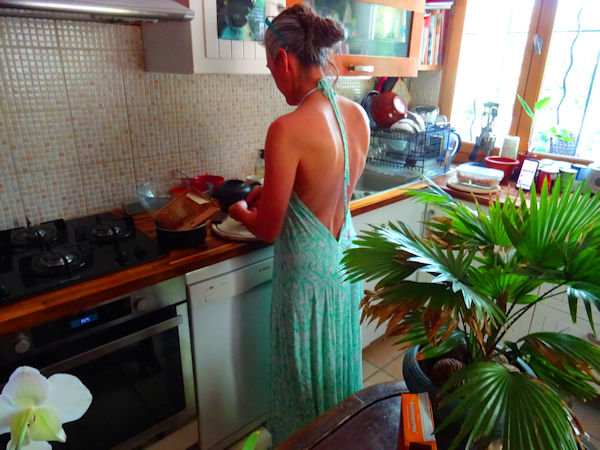 Nous avons fait hier notre premier barbecue de l’année, profitant au passage de notre nouvelle salle à manger en rez-de-jardin – le dessous de la terrasse peint en blanc lumineux par Anti. Nous avions invité Anli et sa chérie. Vers 18 h 15, ma chérie est sortie de son bain après une nouvelle journée à peindre. Ce n’est rien de dire qu’elle ne portait plus du tout la même tenue. Elle a choisi de mettre une magnifique robe de l’Effet Péi, cette marque réunionnaise qu’on aime beaucoup. Cette fois, elle n’a pas été acheté là-bas mais par internet, après que j’ai vu une pub – j’ai aussitôt dit à Anti, celle-là, elle est pour toi. Aucun doute à ce sujet. Ma sublime chérie portait donc cette sublime robe, qui mettait en valeur ses sublimes lignes et son sublime dos, pour cuisiner son célèbre gâteau au chocolat. J’en étais bouche bée, hypnotisé, et ça l’a fait rire joyeusement.