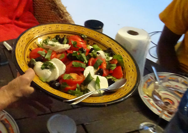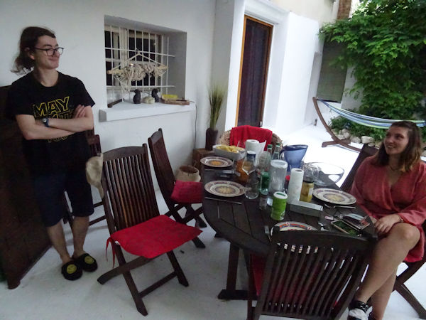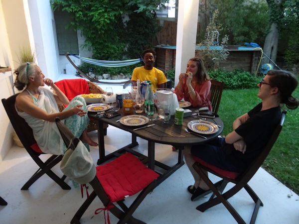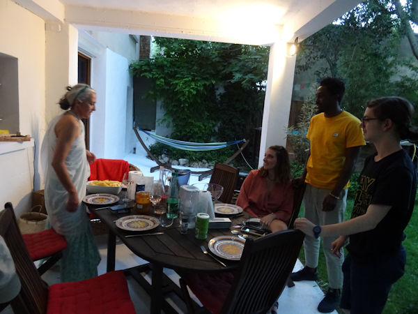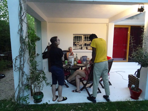 Je vos avais promis des photos de notre nouvelle salle  manger d’été, les voici, prises à l’occasion de notre premier barbecue de l’année (et même de plusieurs années), avec nos invités Anli et sa chérie avec qui il va emménager bientôt. Au menu, des grillades (végés pour nous), une grande salade tomates mozza basilic olives dont il n’est rien resté et un kilo de frites cuites dans la friteuse descendue sur place pour l’occasion. Pour finir, le fameux gâteau au chocolat de Stéphanie. Un régal !