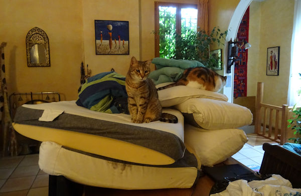 Il y a quelques jours, il a commencé à pleuvoir. On a vite rentré les coussins du salon installé sur la terrasse et tout empilé sur la table du séjour. Une occasion irrésistible de s’installer au sommet pour Chouquette et Abigaëlle.
