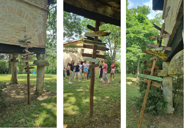 Pour la dernier session du stage avant l’examen, celle qui s’est tenue le weekend dernier, Stéphanie a lancé une idée géniale de cadeau pour Monique, la responsable en chef, et son équipe : un panneau de signalisation avec des flèches indiquant toutes les villes dont sont venus les stagiaires, un peu dans le style de cette photo qu’elle a envoyé au groupe :