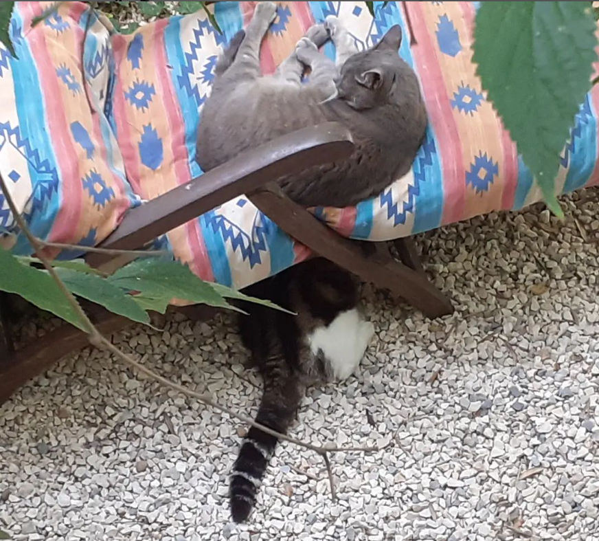 Quand il fait très chaud, nos chats se mettent à l’ombre, rien de plus naturel. C’est le cas de Gus, par exemple, sur sa chaise longue préférée à l’ombre des oliviers et de la vigne vierge. Mais Malley a poussé le concept un cran plus loin : lui, il se met à l’ombre de l’ombre. Voyez plutôt;