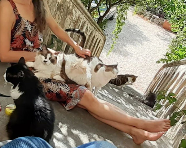 Il y a quelques jours, Anti s’est installée en haut des marches pour peigner Bianco, afin de lui retirer les petites boules piquantes et autres débris végétaux qu’il accumule dans ses longs poils en allant dans les hautes herbes. Ca n’a pas traîné : au bout de quelques minutes, ils étaient quatre à faire la queue au salon de coiffure spécial chats.