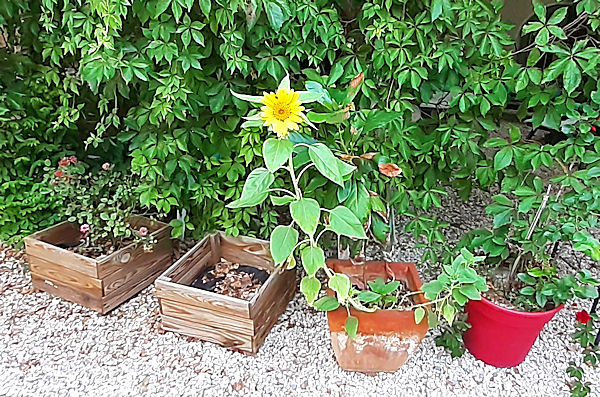 Et tout près de là se trouve le pot où a poussé le tournesol de la photo. Donc, soit la graine a été apportée là par un mulot, soit elle l’a été par un oiseau. Ou peut-être même par une fourmi ?