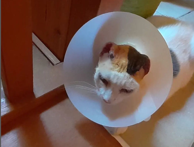 Quel soulagement depuis son retour à la maison hier en fin de journée. Le choc de la nouvelle la semaine précédente, plus l’appréhension de l’opération, des opérations à vrai dire, car il a aussi été soulagé de quelques dents en mauvais état, ça faisait beaucoup pour mon p’tit coeur. Mais de le voir en forme, toujours aussi mignon, ben, pfiou ! ça fait du bien. Ce matin, il tient une super patate ! ça va être quelque chose de le garder enfermé pendant 1 semaine (temps de port de la collerette)… Heureusement que la canicule fait que de toute façon, portes et fenêtres restent fermées toute la journée, de ce côté là, ça ne change pas nos habitudes ni celles des autres minous. La seule différence est que l’accès à l’escalier qui mène au rez-de-chaussée est fermé provisoirement. Il va y avoir du groom service !