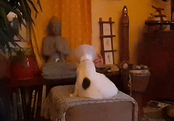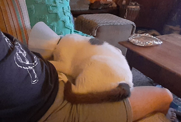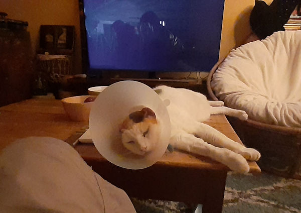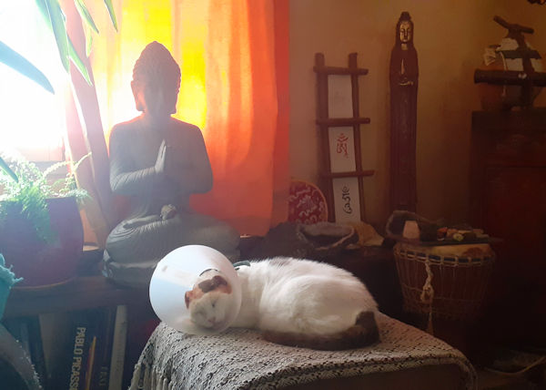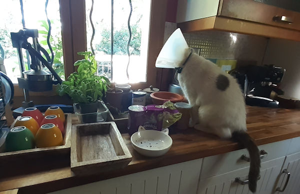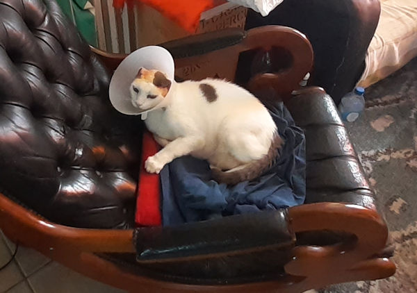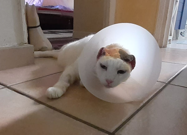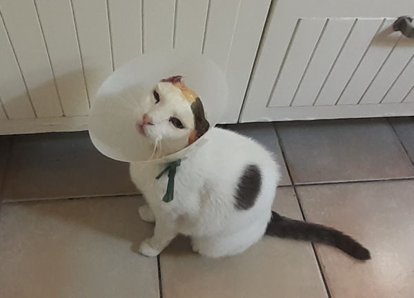 Maoré supporte remarquablement bien sa collerette, on n’a jamais vu ça auparavant avec nos autres chats qui ont eu à en porter une. Ses cicatrices sont hyper propres, il récupère vite, il se promène un peu partout sur l’étage et il a retrouvé son appétit dès le soir de son retour à la maison.