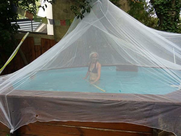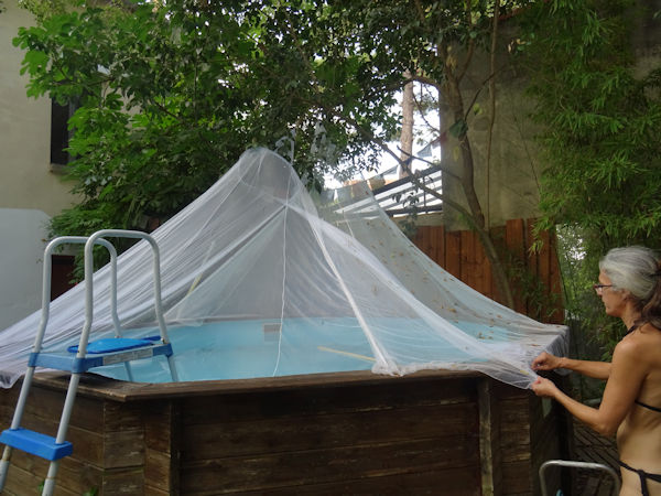 Aujourd’hui, chez nous, c’est orage (enfin, bon, pour le moment, pas une goutte n’est tombée). Il est même prévu de la grêle. Stéphanie s’est dit que ce serait l’occasion idéale de tester la résistance du dispositif qu’elle a imaginé pour protéger la piscine l’hiver prochain : avec deux moustiquaires. Elle en avait déjà mis une en place il y a quelques mois et cela s’est révélé très efficace pour limiter la plupart des chutes de débris végétaux dans l’eau depuis les arbres environnants. Hier, elle a complété avec la deuxième moustiquaire.