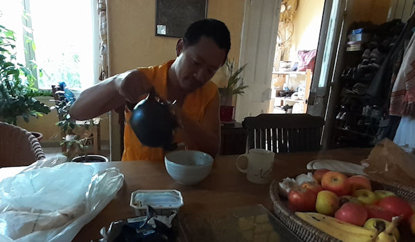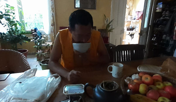 Hier vers 11 h, Lama nous a improvisé un atelier tsampa, plat typiquement tibétain à base de farine d’orge grillée.