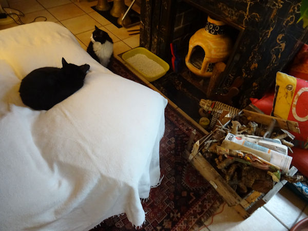 Stéphanie a rangé les coussins du salon installé sur la terrasse, elle en a fait un beau tas bien stable recouvert d’un tissu blanc, posé juste devant la cheminée, les chats adorent. Et pour la cheminée, justement, elle a rentré du petit bois en cas d’envie de flambée dans la journée.