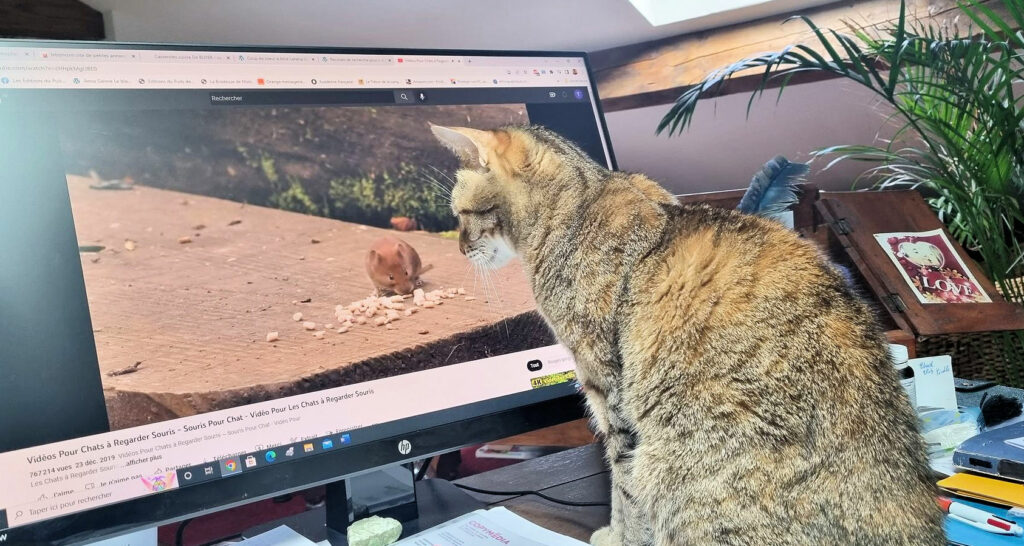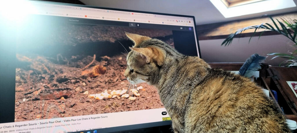 Hier, je devais remplir des papiers importants, mais Aby avait décidé que je devais plutôt m’occuper d’elle. Hum… J’ai donc eu l’idée de lancer une vidéo pour chats sur mon PC, histoire de créer une diversion ; c’est celle qui figure en début de cette note. Vous vous demandez sûrement si ça a marché ? Eh bien oui ! La preuve en images :