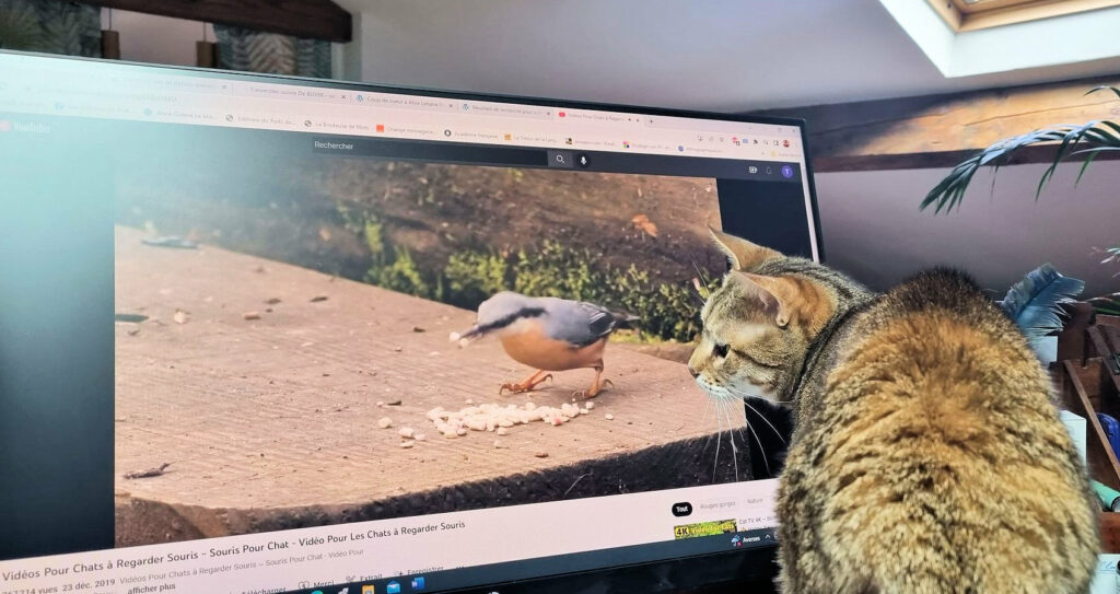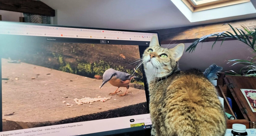 Le problème, c’est que ma pauvre Nénette (oui, je parle bien d’Aby, Nénette, c’est l’un de ses surnoms) ne comprenait plus rien ! Elle humait l’air sans rien sentir, levait la tête au ciel quand l’oiseau s’envolait et cherchait derrière l’écran se demandant où ce p’tit mulot avait bien pu se cacher. Du coup, j’ai vite arrêté. De toute façon, il y avait une erreur dans les papiers et je n’ai pas pu les signer. Du coup, je me suis mise une vidéo pour moi et là… Mmmm… vivement l’printemps !