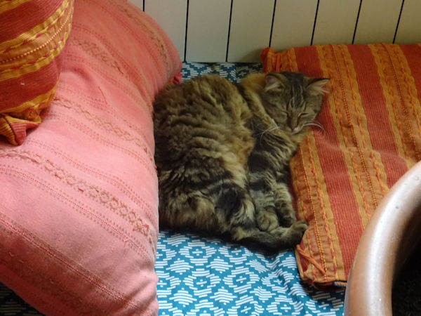 Désormais, elle se cale entre deux coussins, en plus de faire dos au radiateur (qui est encore éteint chez nous pour le moment, mais son instinct lui dit que bientôt, ça chauffera).