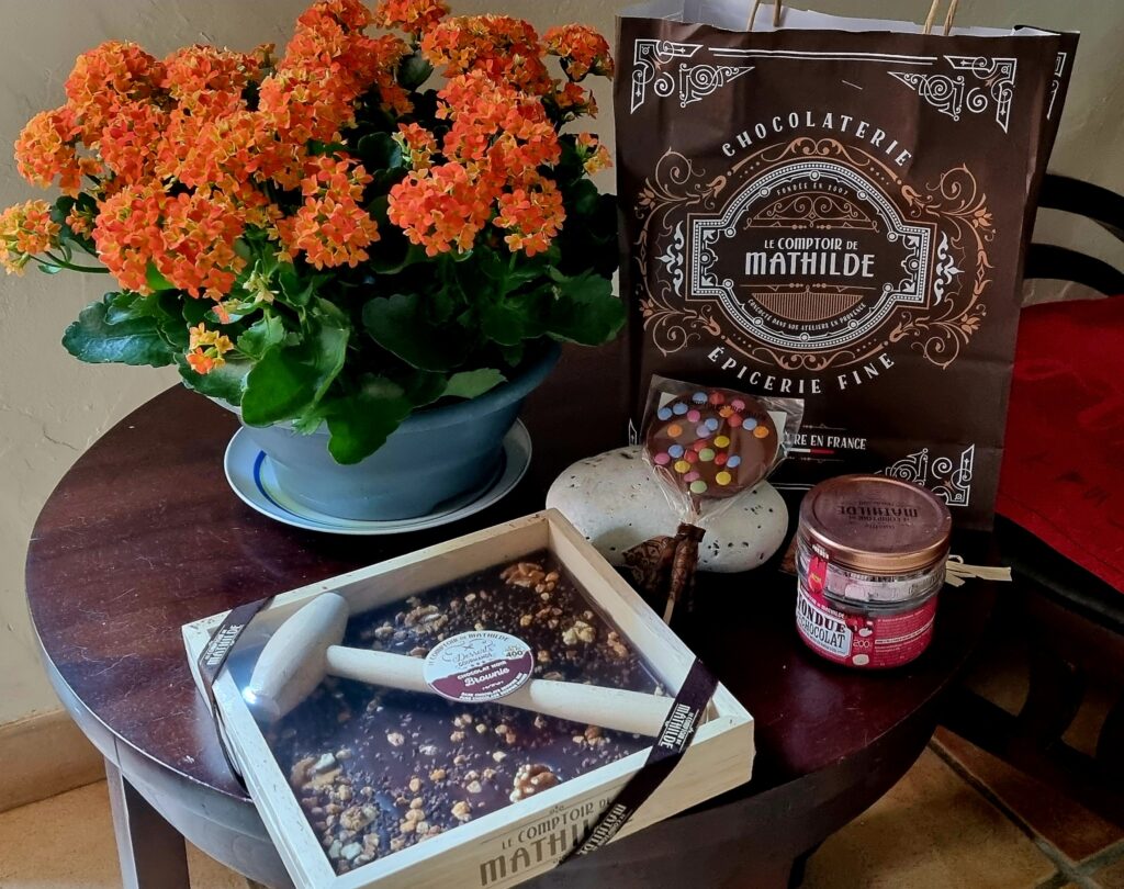 Jolie mise en scène du chocolat avec une jolie plante fleurie aux couleurs automnales. Miam, slurp!