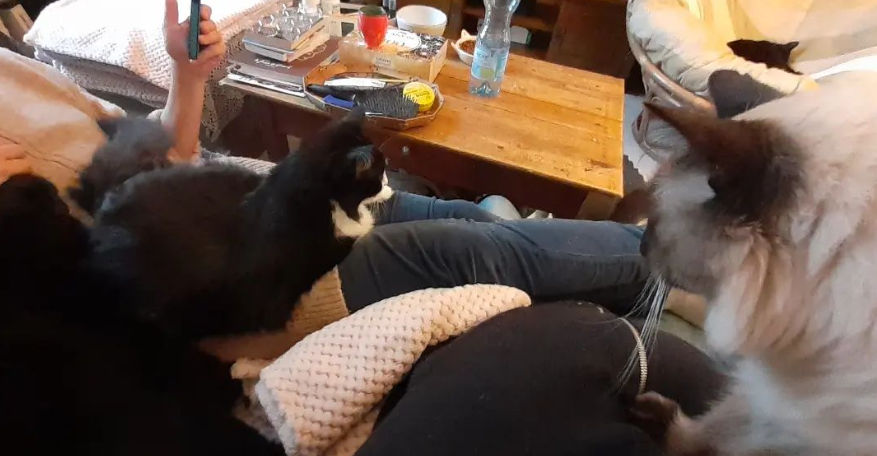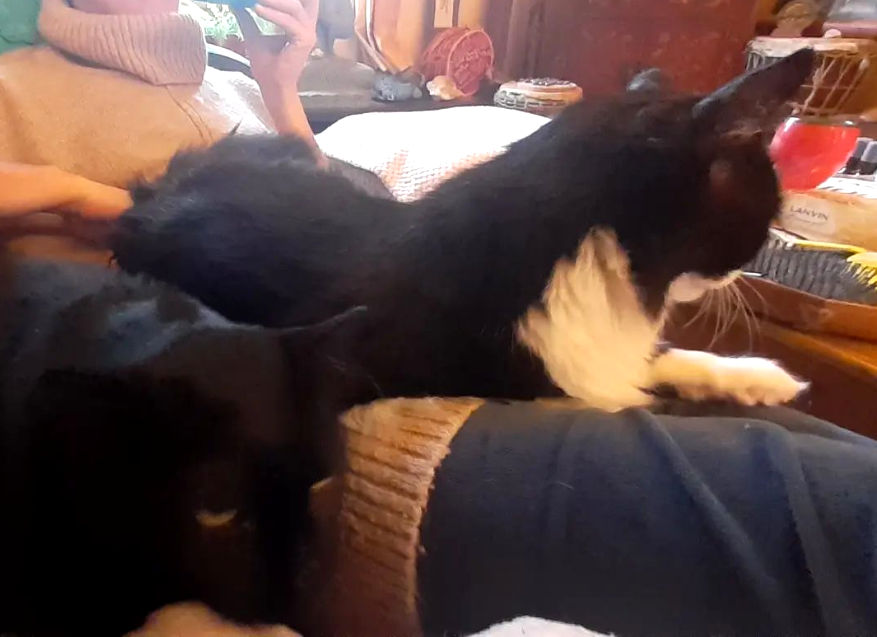 Ca s’est un peu dégagé dans les minutes qui ont suivi, Morphée a pu se dégager partiellement, quant à Totoro il est parti ailleurs. Notez bien que moi, j’étais encore une couche plus bas, sous les jambes d’Anti. C’est comme ça, quand on est entre chats et on adore ça.