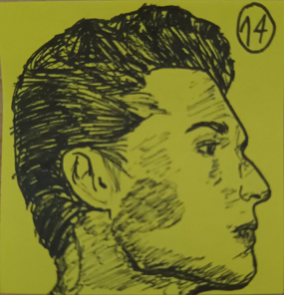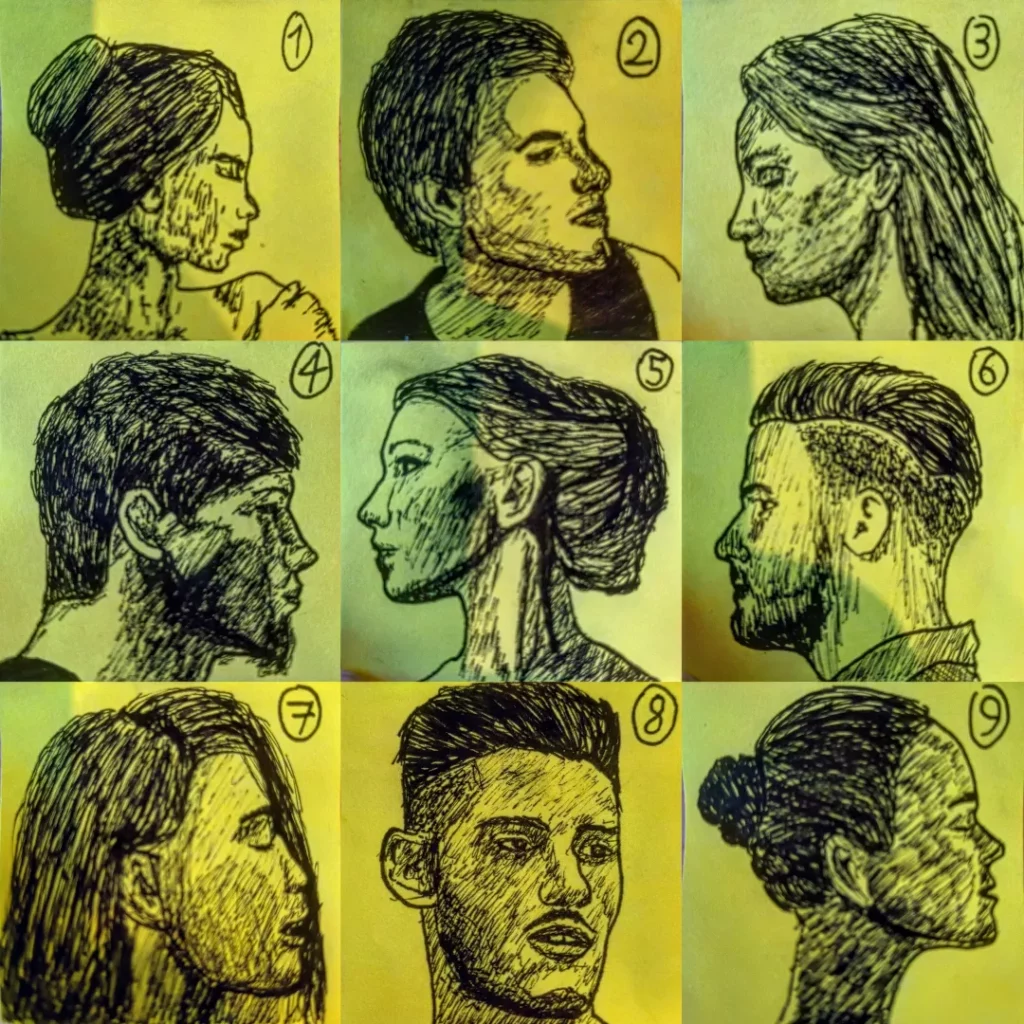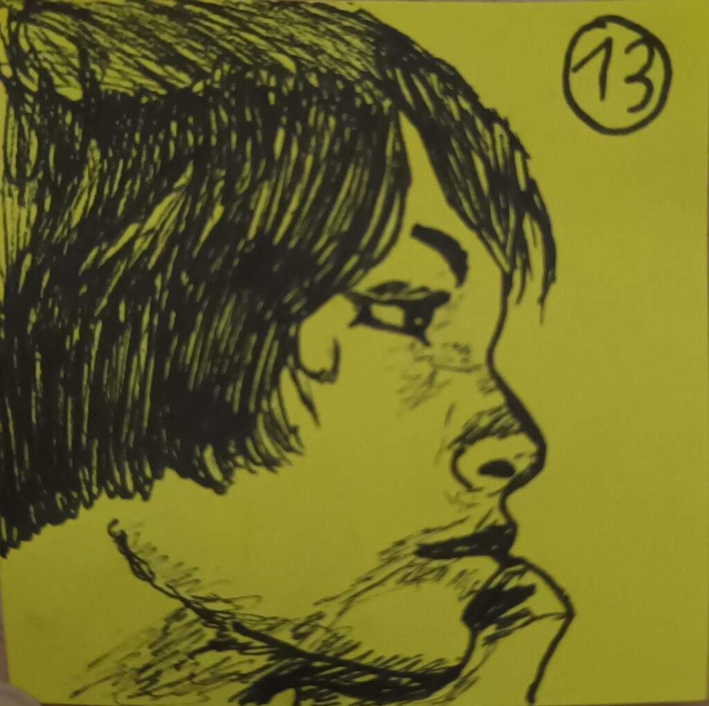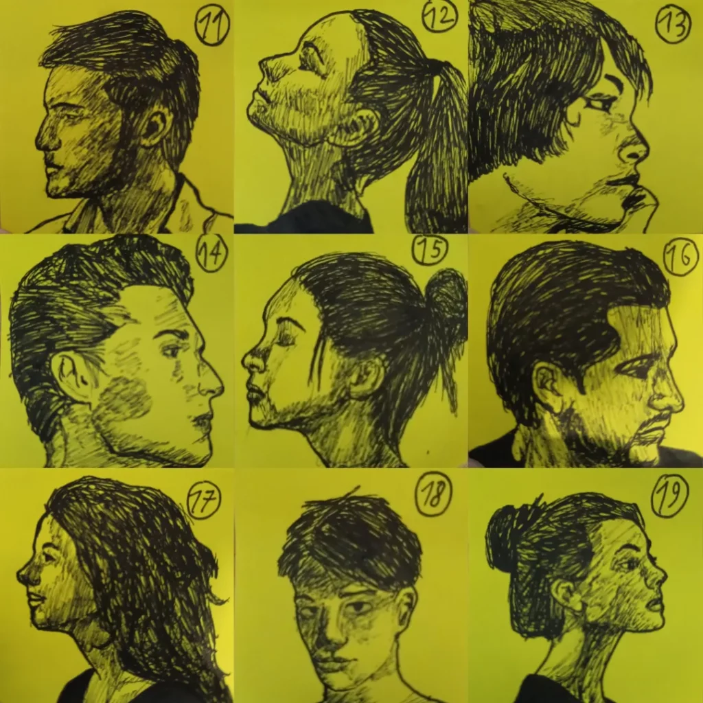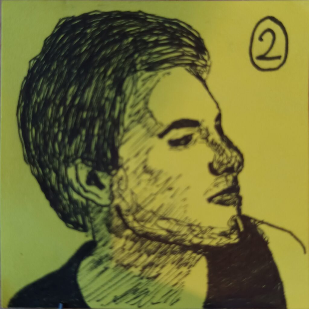 Depuis quelques temps, Enzo dessine des visages sur des post-it. Le support impose un format carré de petite taille et le but est toujours le même : s’entraîner à faire des croquis variés le plus vite possible, ici avec des liners noirs de différents diamètres.