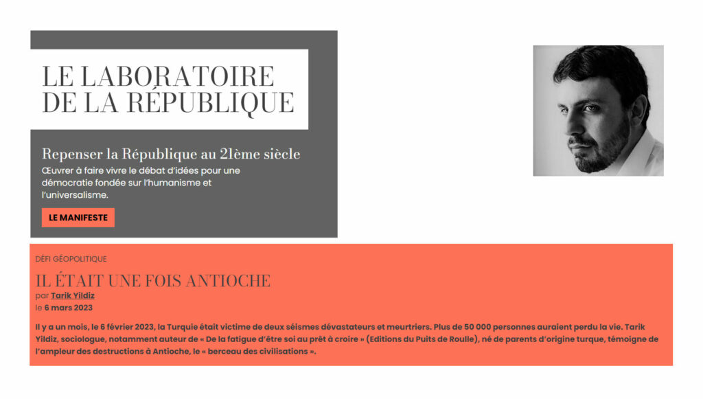 Auteur aux Editions du Puits de Roulle et ami, Tarik Yildiz, sociologue, notamment auteur de De la fatigue d’être soi au prêt à croire, vient de publier un très beau texte sur Antioche, la patrie de sa famille durement touchée par les séismes du mois dernier, pour Le laboratoire de la République. Je le pose ici.