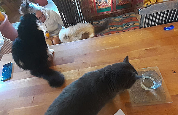 Le mot anglais fluffy se traduit par duveteux et désigne les peluches – ou ici les animaux – au pelage très abondant. Plusieurs de nos chats font partie de ce club, mais il est rare de parvenir à en photographier plus de deux ensemble. Voici une photo récente de trois d’entre eux : Will, Bianco et Tsewa.