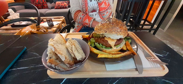 Nous avons mangé hier à midi dans un nouveau lieu très plaisant, La Fabrik. Il ne s’agit pas que d’un restau – d’ailleurs il a des horaires très restreints – mais aussi d’un espace de co-working, d’une salle de sports et d’un hébergement pour diverses activités de bien-être, proposées par des tiers (massage, kiné et peut-être un jour réflexologie, c’est par ce biais que Stéphanie a découvert son existence).