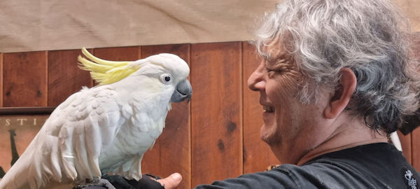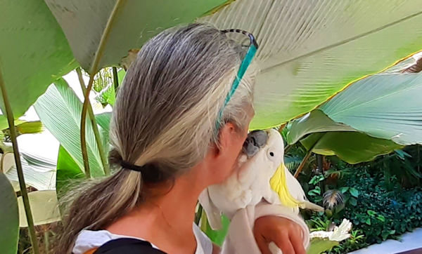 Le Chef converse quelquefois avec un cacatoès qui loge dans la volière d’un parc public. Il vient se faire gratouiller le ventre ( l’oiseau hein pas le Chef)!