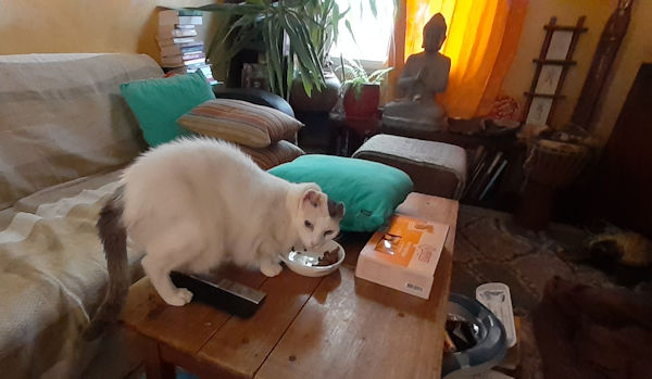 Nous avons dû accompagner Mao dimanche chez le véto de garde. Il était dans un état de faiblesse très inquiétant. Diagnostic : épanchement de liquide quelque part dans ses poumons. Lundi, je l’ai conduit chez nos vétos habituels pour une première ponction. Il s’agissait bien de pus dans la cavité pleurale – en termes techniques, un pyothorax.