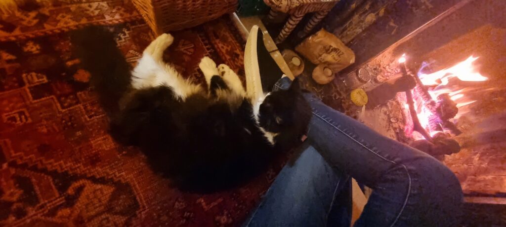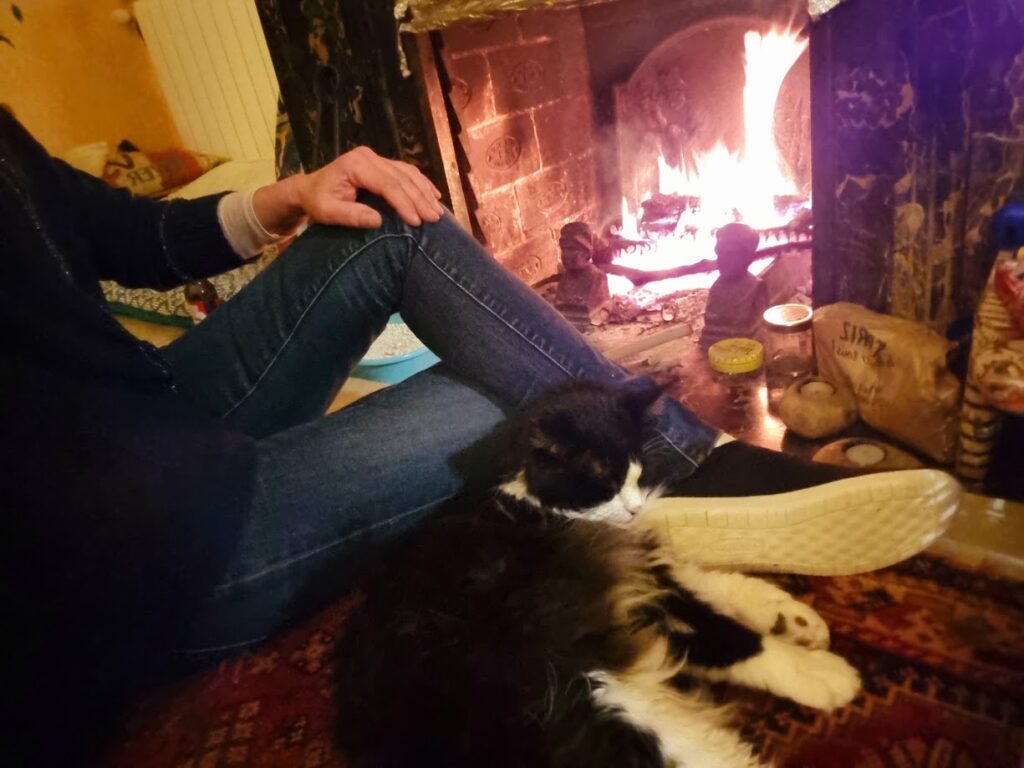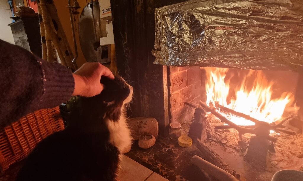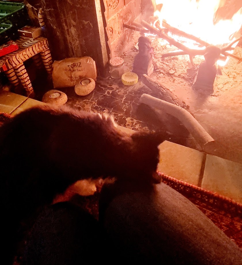 Will est totalement fou de ces flambées. A peine Anti ouvre t-elle le foyer qu’il vient s’installer devant en attendant impatiemment ue le petit bois soit mis en place et que l’allumette lance la flambée. Ensuite il reste là souvent aussi longtemps qu’il y a des braises. Souvenir de son enfance avant de se retrouver à la rue ?