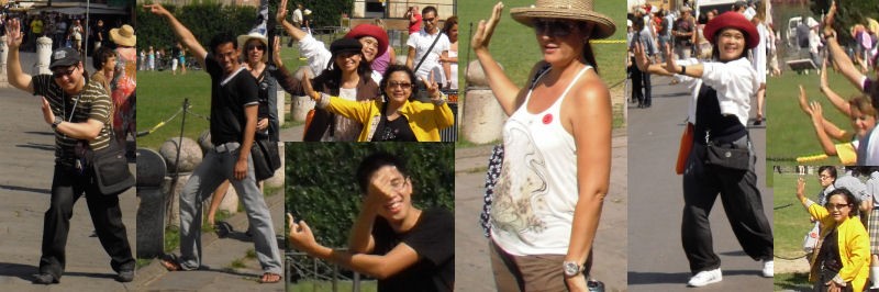 A ce sujet-là – ne pas pousser – je vous ai fait pour ce matin un petit pot-pourri de photos, prises à Pise il y a quelques jours, de tous ces touristes qui trouvent teeeeeeellement drôle de faire semblant d’empêcher la tour de tomber avec leurs petits bras musclés. Mention spéciale au petit monsieur japonais (ci-dessous, à droite) qui fait, à lui tout seul, à la fois la prise de vue follement originale et la pose qui déchire rien qu’avec son index habilement positionné au premier plan. Trop fort.